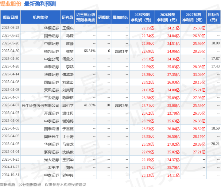 证券之星数据中心根据近三年发布的研报数据计算,德邦证券翟堃研究员团队对该股研究较为深入,近三年预测准确度均值为66.31%,其预测2025年度归属净利润为盈利22.69亿,根据现价换算的预测PE为11.78。